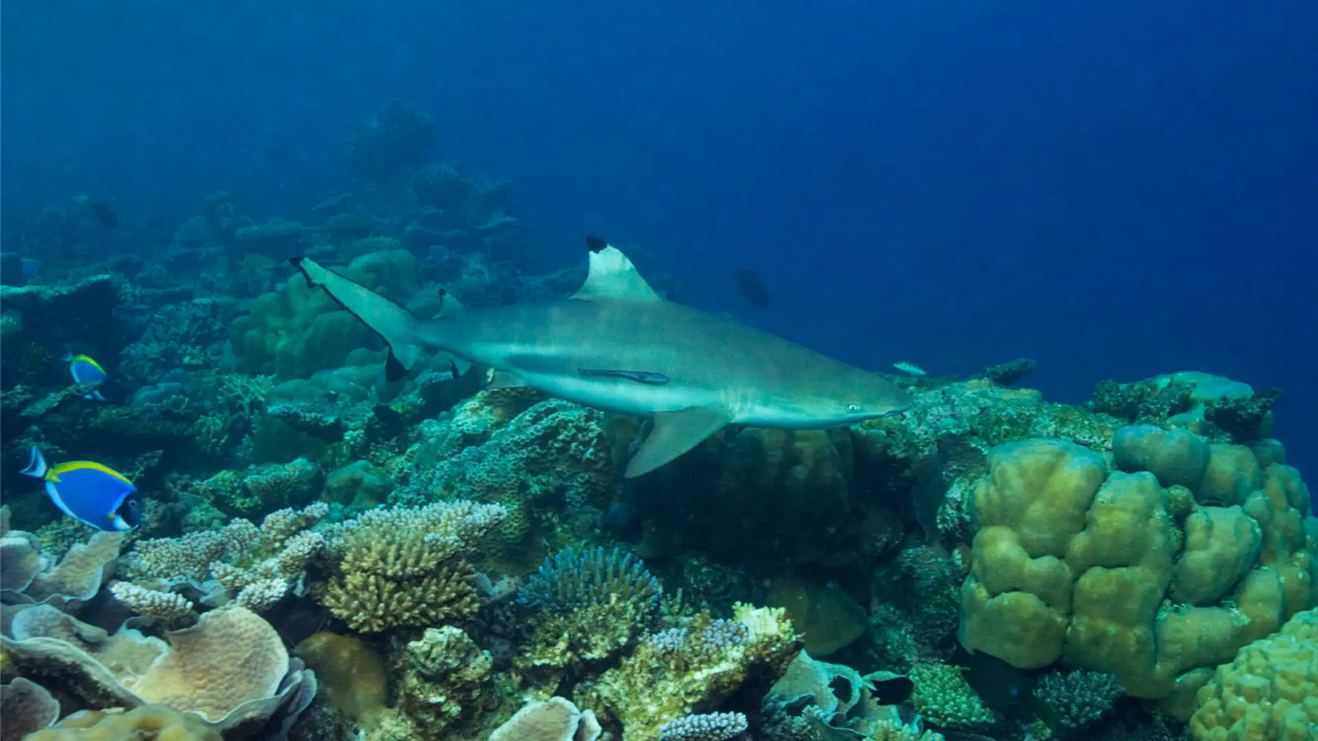 skvěle zachovalý domácí korálový útes plný barevných korálových rybek včetně útesových žraloků